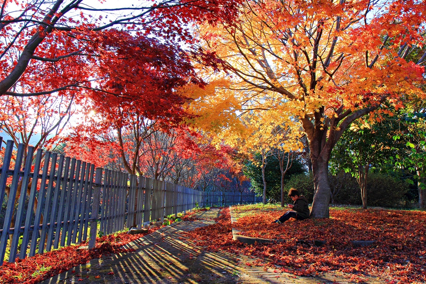 아름다운 단풍나무 아래에서 이 멋진 가을 남자는