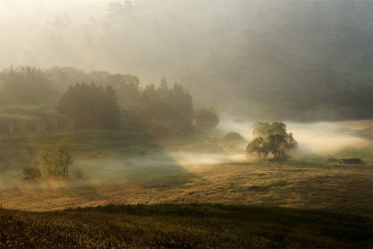 왕버들이 자라고 있는 저수지의 아침 운해