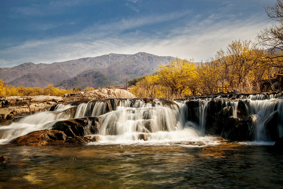구례 산동의 물소리와 산수유를 담았습니다. nd필터를 이용하여 셔터속도를 조정하였습니다.