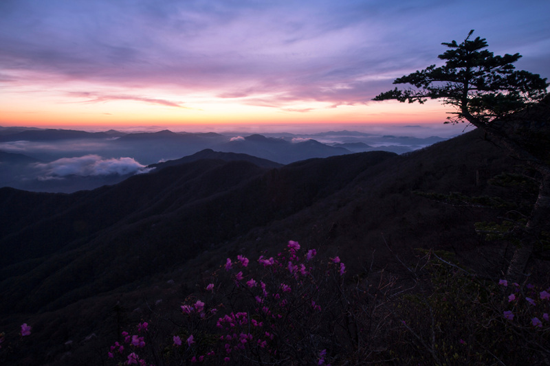백운산에 피어있는 진달래 향 맏으며 신선대에서 지리산을 이른새백 바라봅니다.
