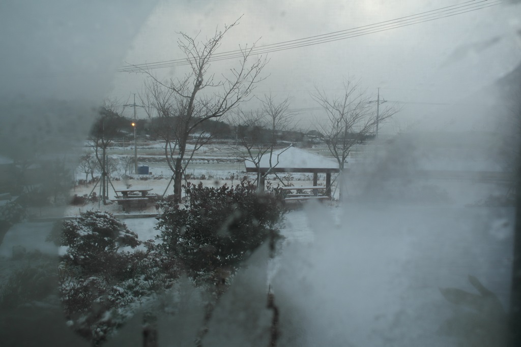 영광에 첫 눈이 오던 날 창으로 보는 풍경