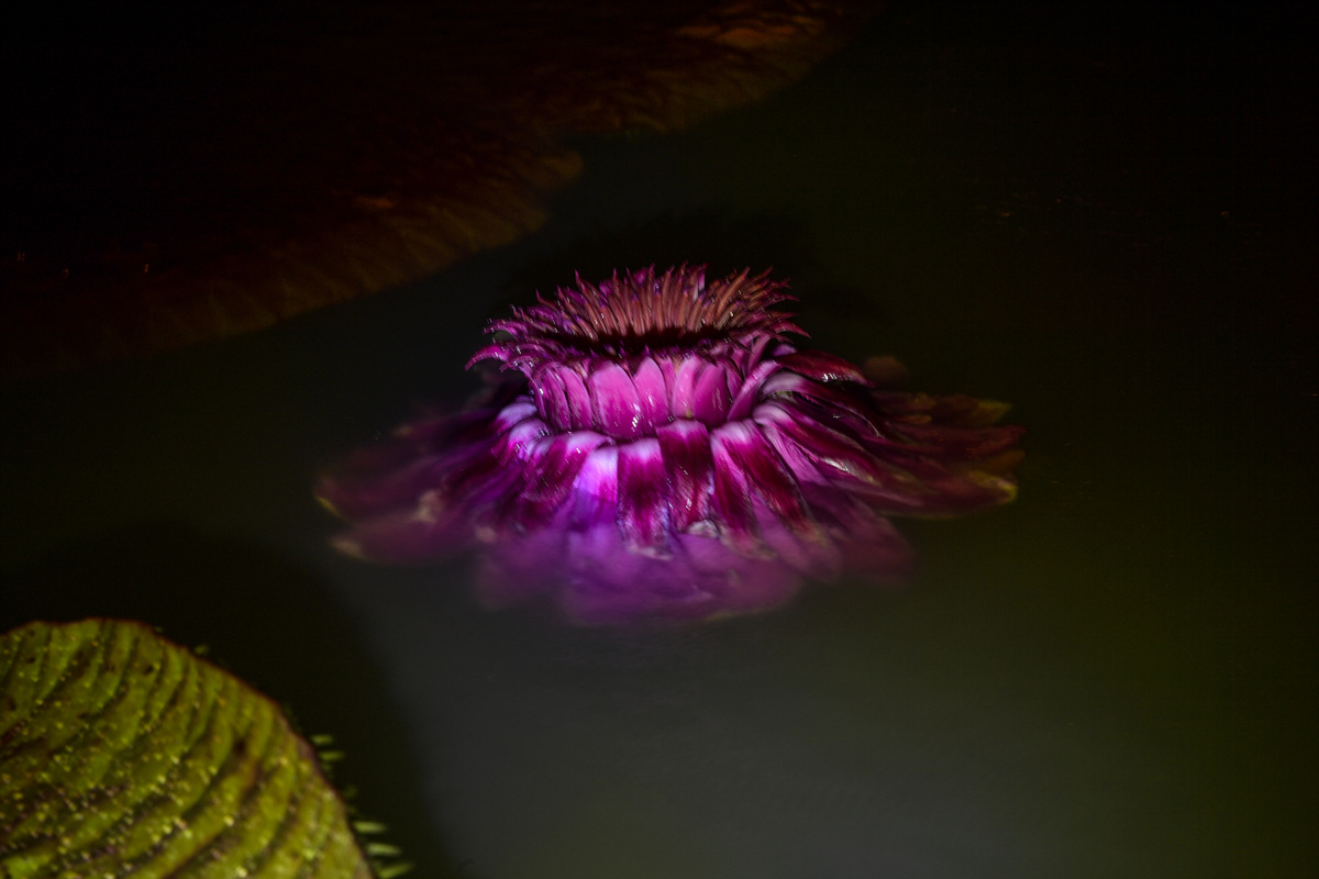 어제 저녁 내린 폭우로 인해 물 속에서 대관식을 치른 빅토리아 연꽃입니다.