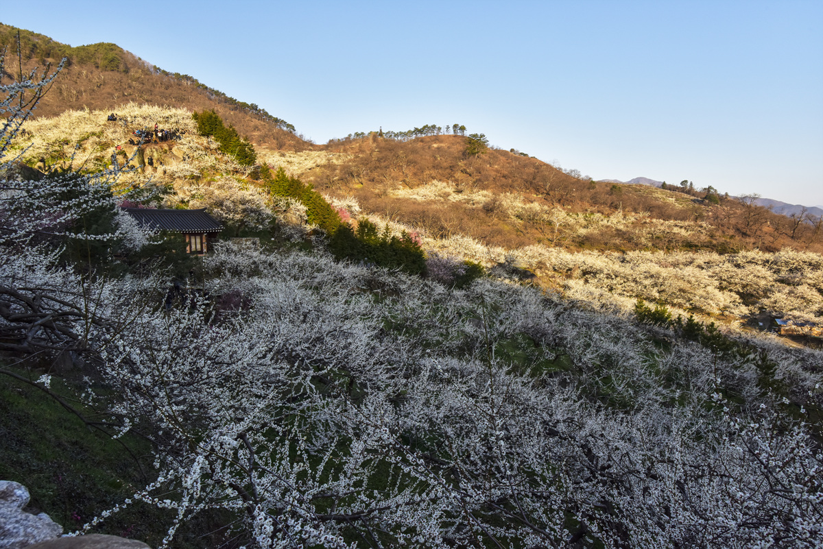 매화가 만개하여 봄 내음이 가득한 광양 홍쌍리 매화마을 전경입니다.