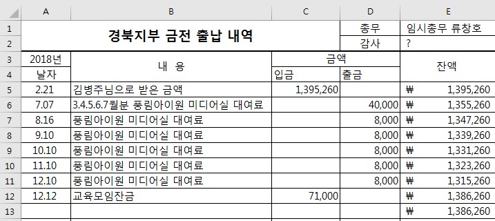 2019년12월08일 현재 경북지부 금천출납현황