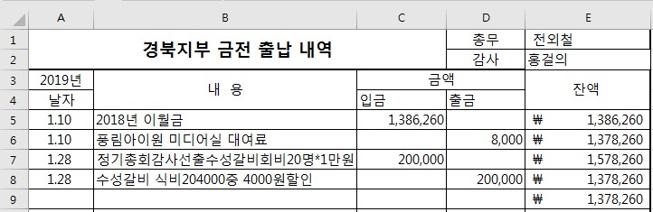 2019년01월31일 현재 경북지부 금천출납현황