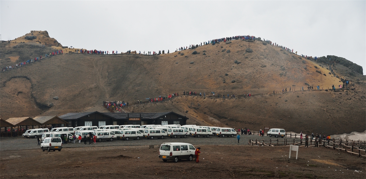 백두산 천지로 가는 인파 와 승합차행렬