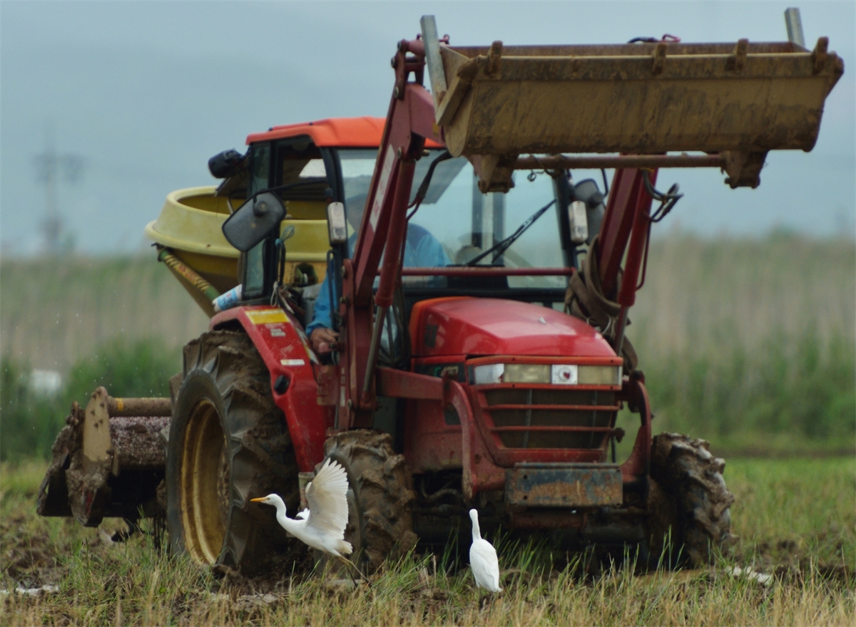 경주 강동뜰에서 모내기 준비작업중인 트랙트와 백로