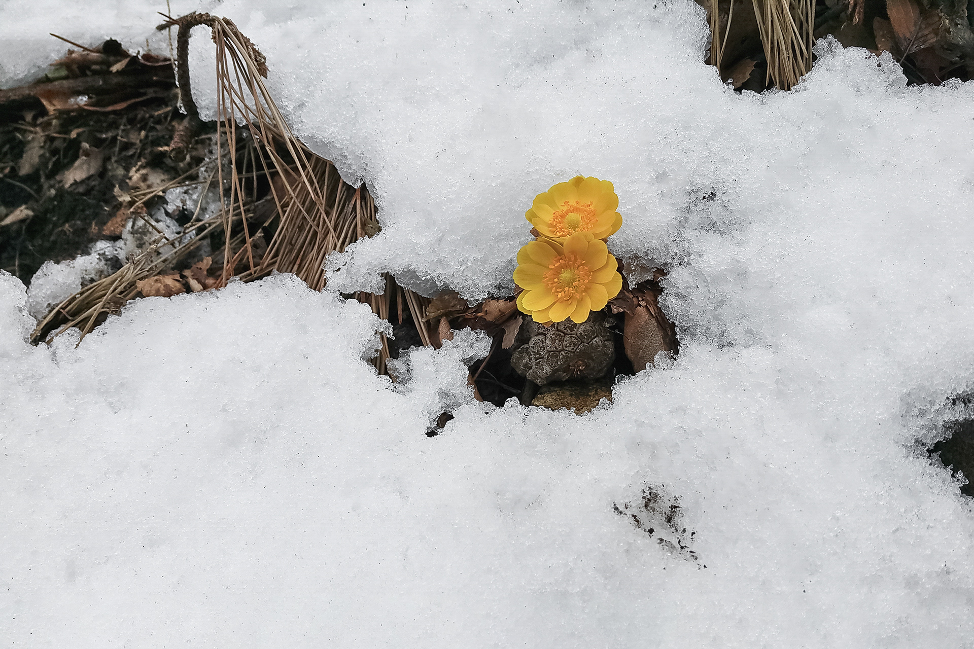 복수초는 뿌리에서 열을 발산 눈이 덮혀도 꽃 언저리가 녹는다고 합니다.