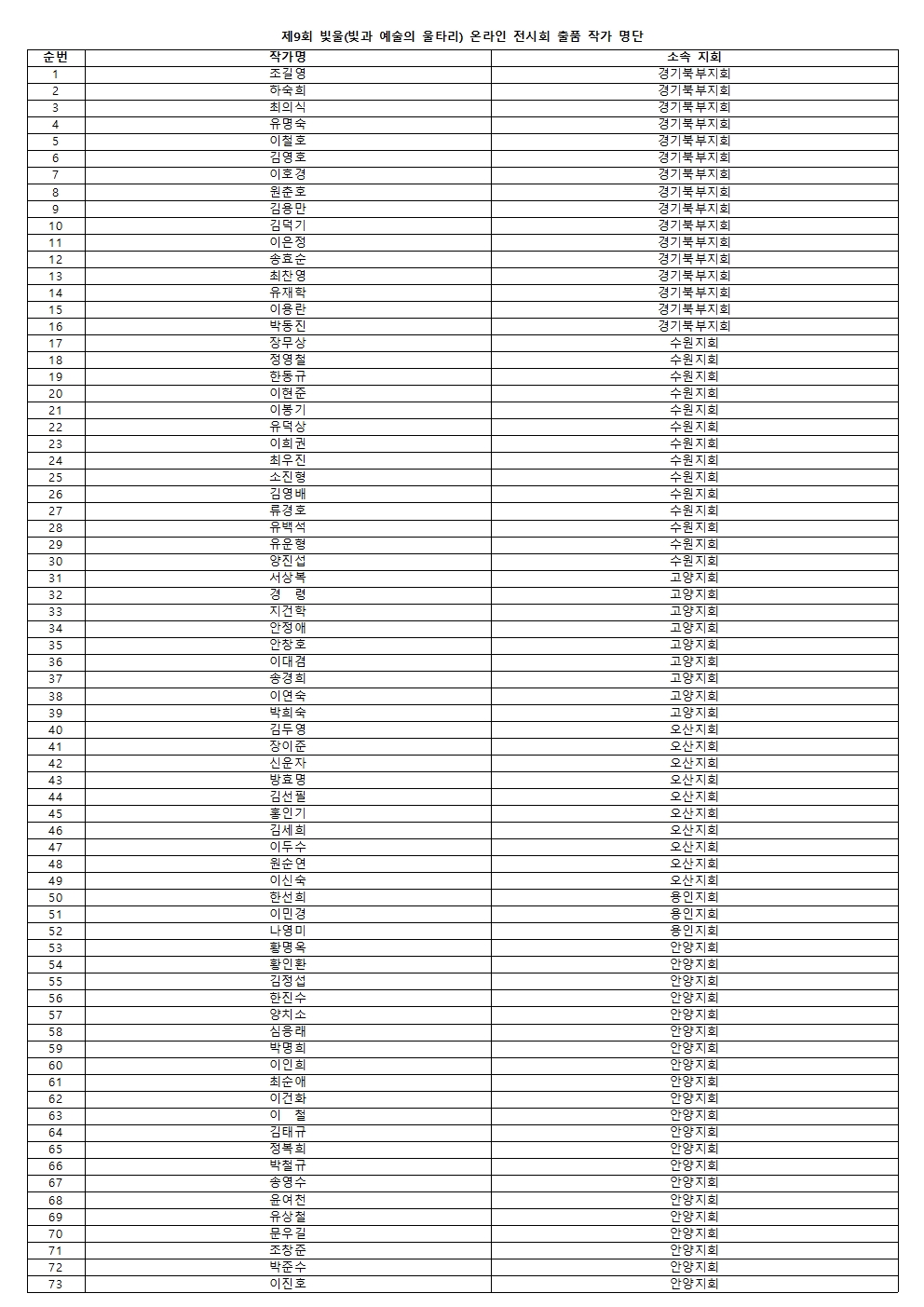 제9회 온라인 전시회 빛울(빛과 예술의 울타리) 참여작가님(지회별)