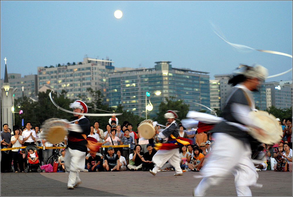 보름달 아래서의 흥겹게 마당을 가로 지르는 모습은 한가위의
