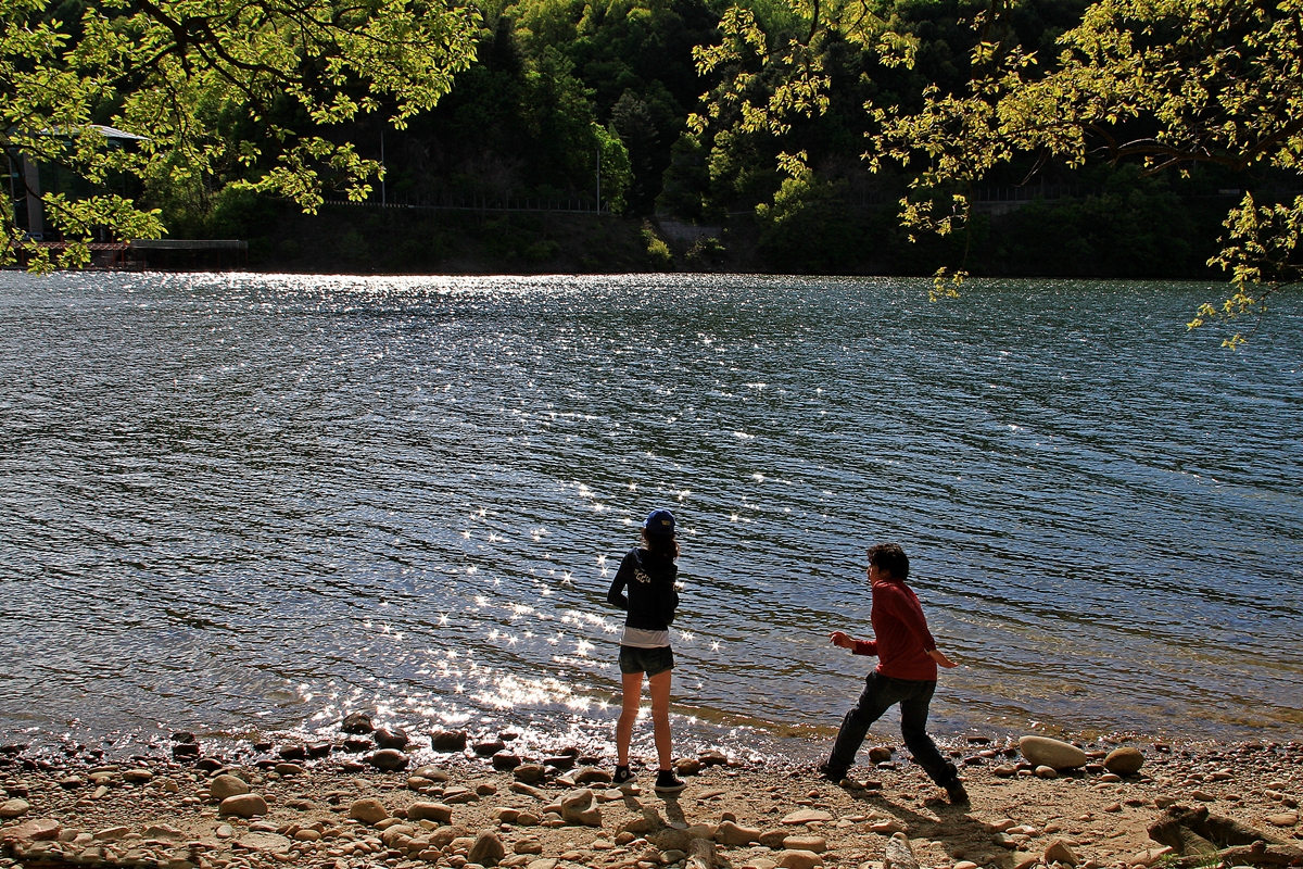 남이섬에서 연인들이 수제비 뜨기 놀이를 하고 있어