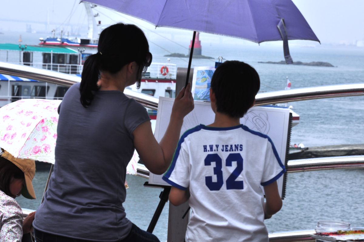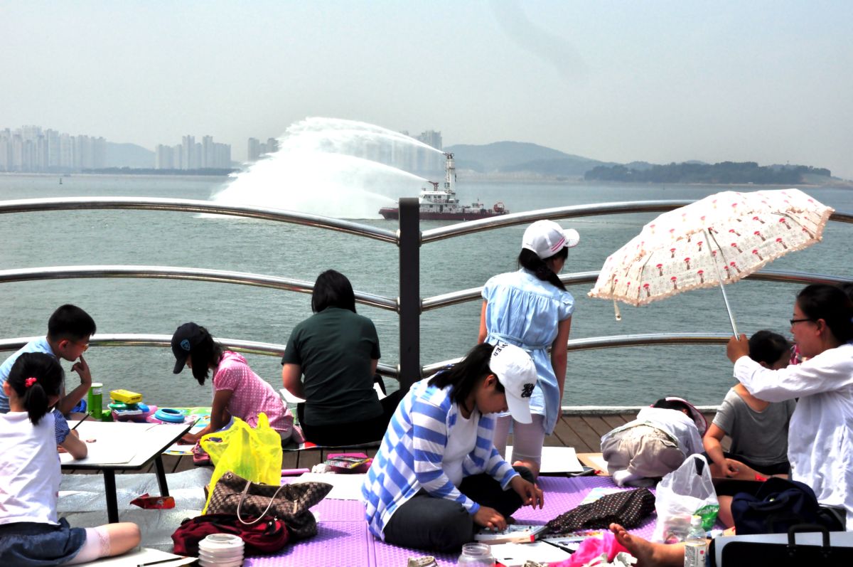 가족과 바다를 그리는 모습