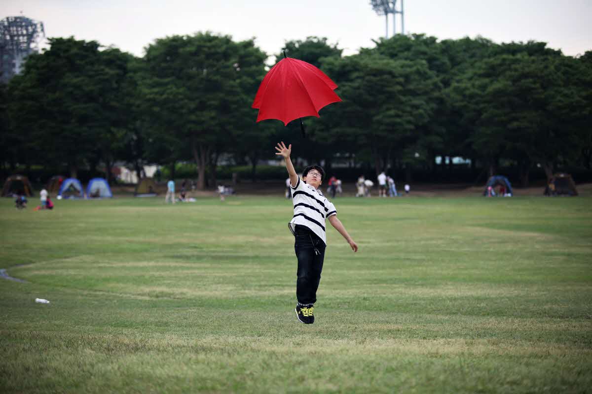 올림픽 공원서 날라 가는 우산을 잡을려 순간포착