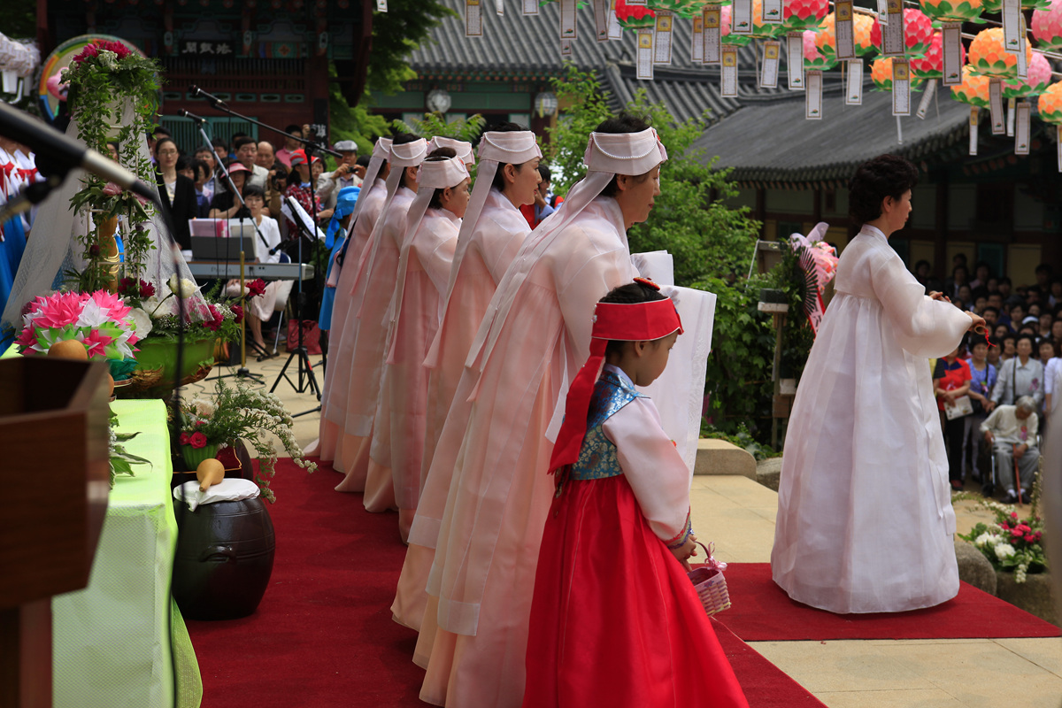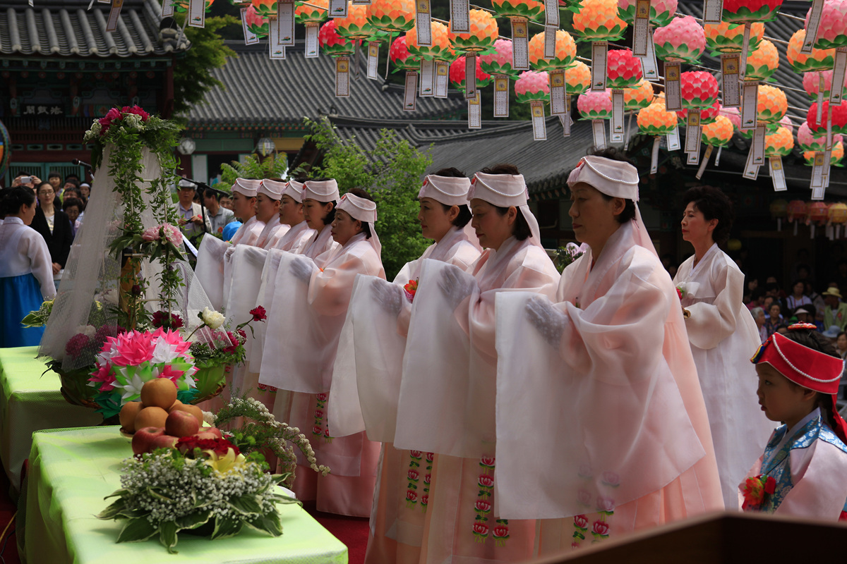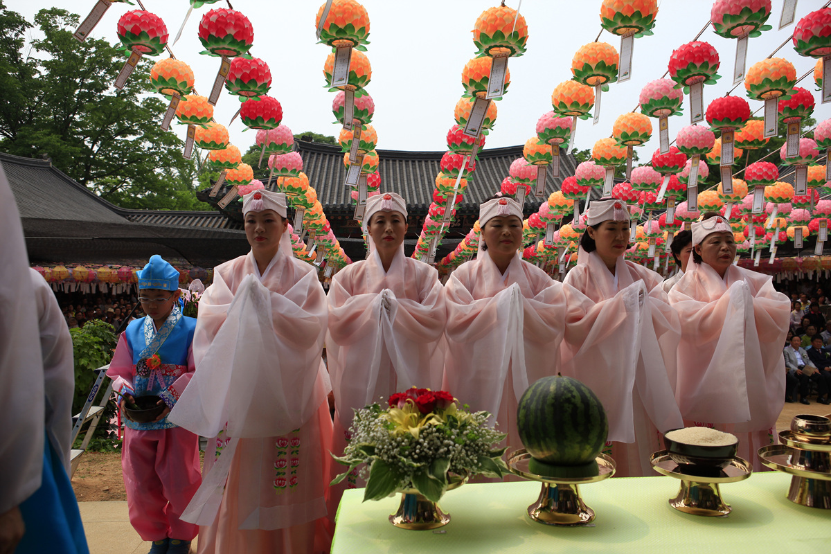 석가모니 부처님 탄생일에 육법 공양을 올리는신도님들에 아름답고 정성어린 모습