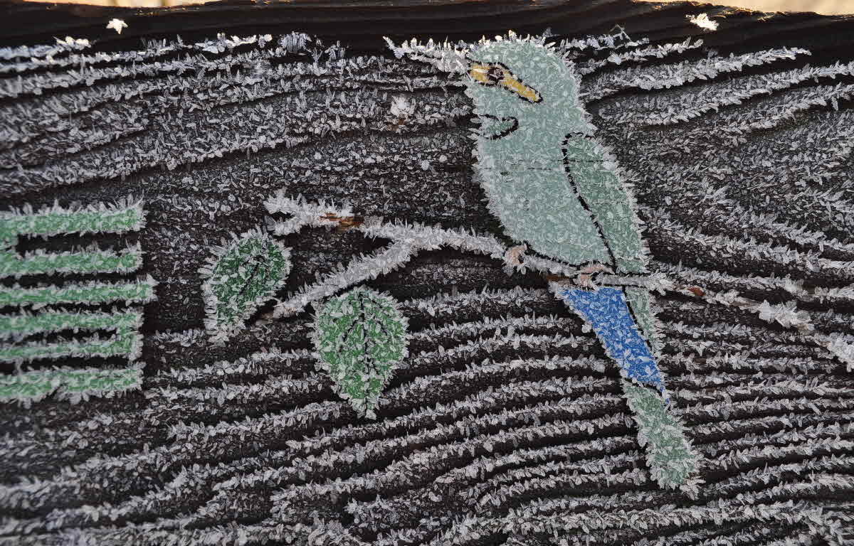 경인천 늪지 조류 안내판의 새모양 그림이 추어서서리가 내려 새로운 그림판이 만들어진것 처럼 보여서서 한참을 구경하다 재미있는 상태라 촬영을 했습니다.