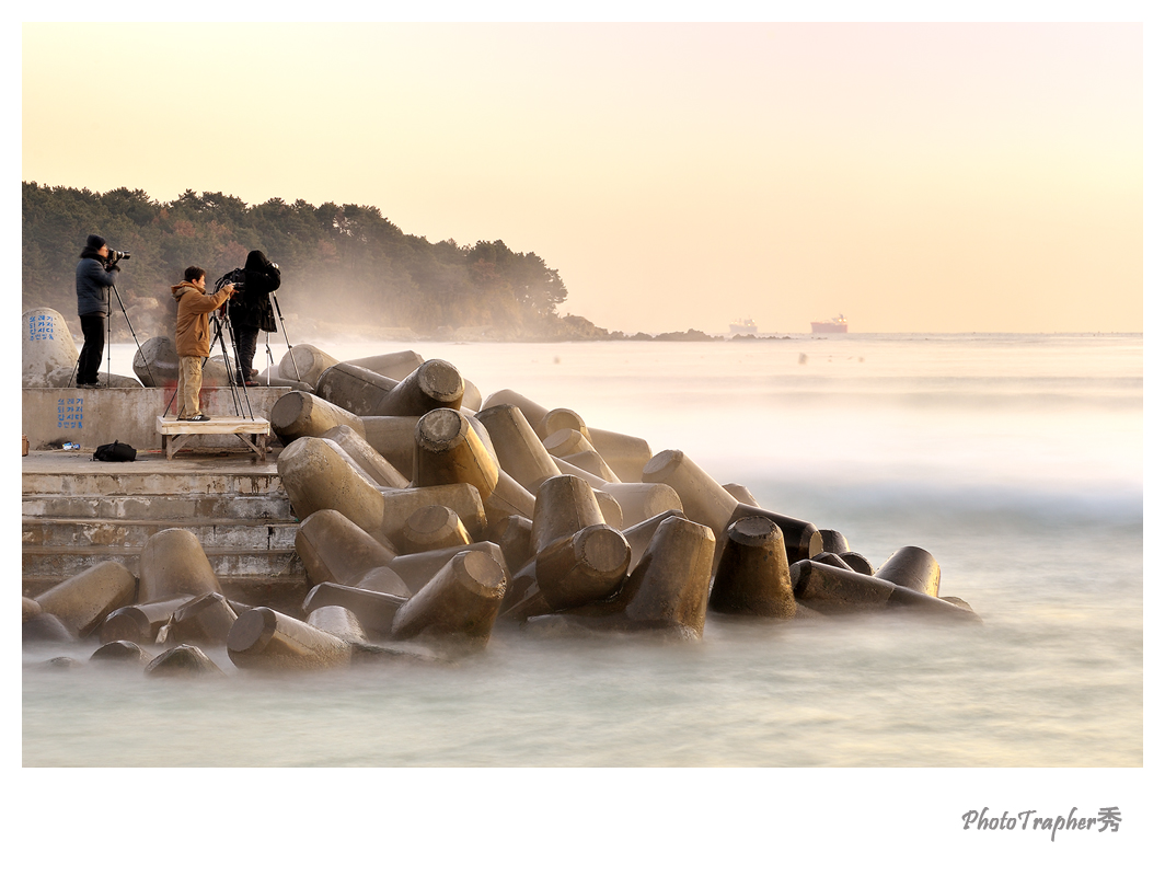 명선도의 일출을 기다리며 파도와 해무속에서 추위를 감래하는