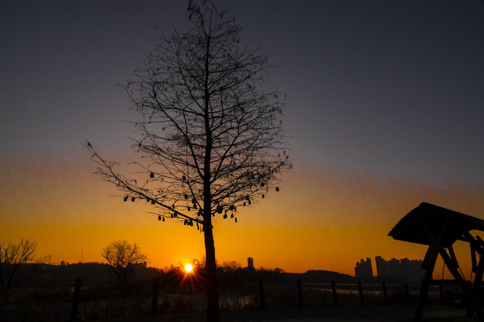 새해 첫날에 왕송호수 소원지 매달아 놓은 나무의 뒤쪽으로 떠오르는 해
