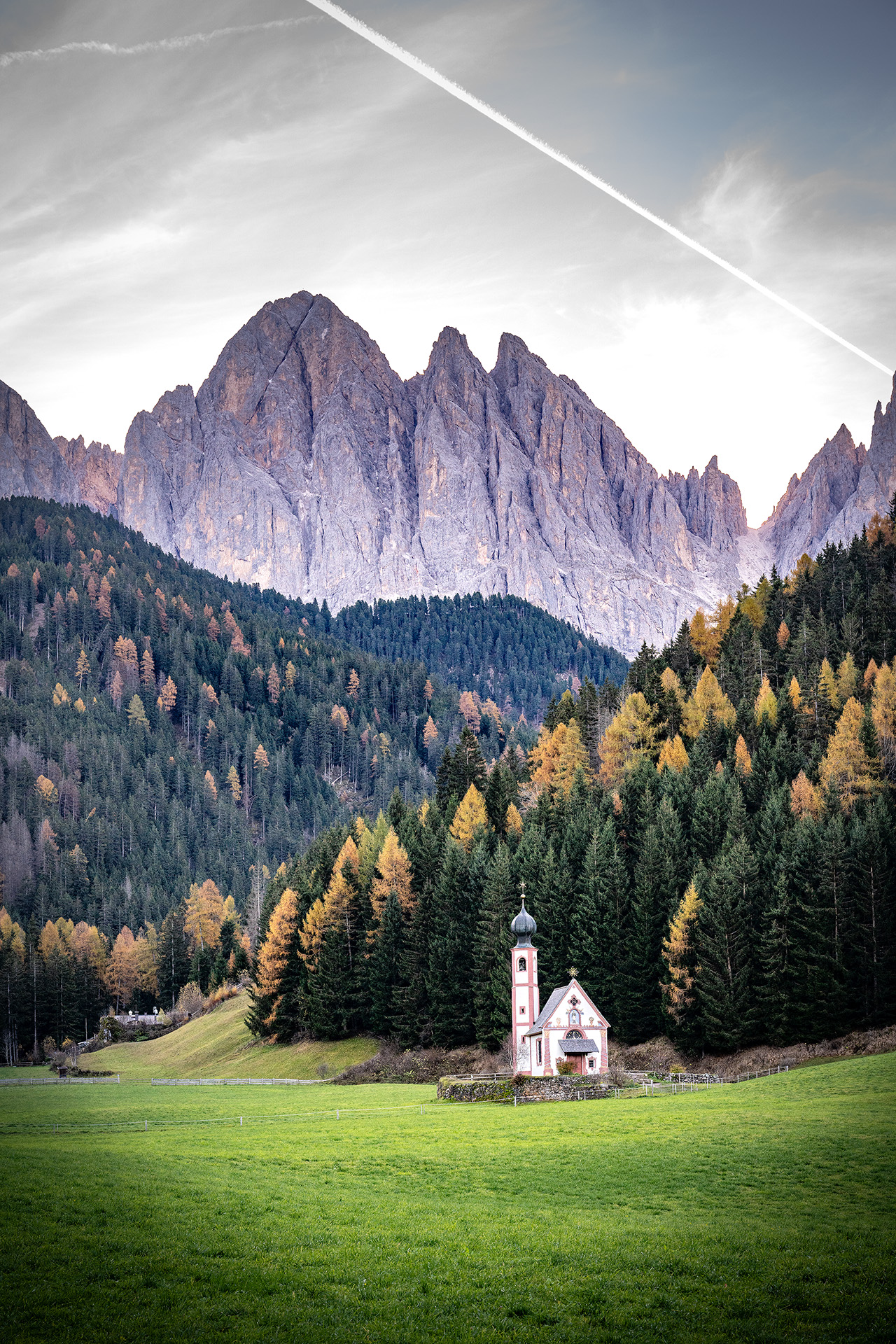 이태리 돌로미티 푸네스 계곡에 위치한 오들레 산맥의 아래 마을