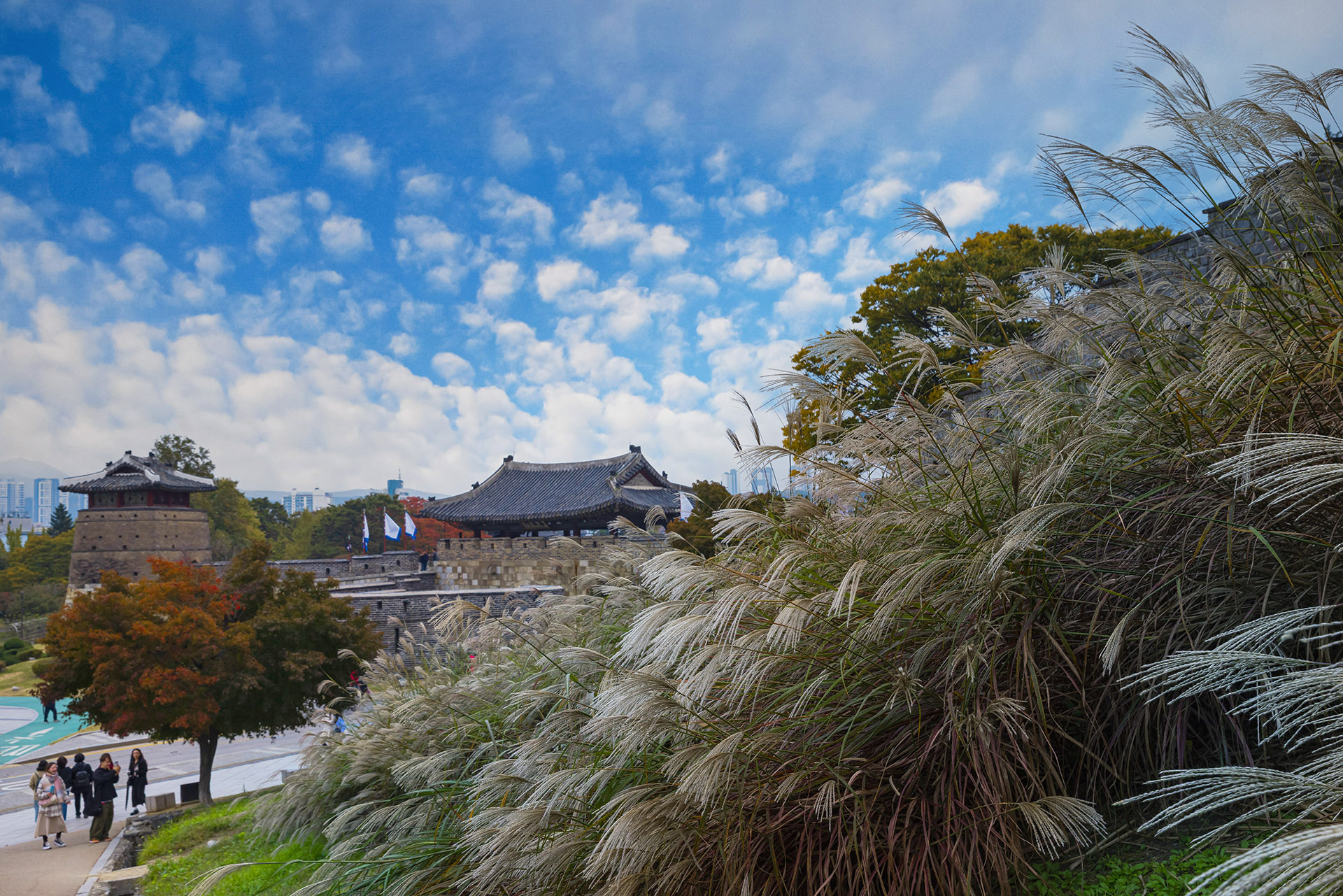 수원화성에 억새꽃이 곱게 피어 갈바람에 춤을추며 노래를 부르고 있고