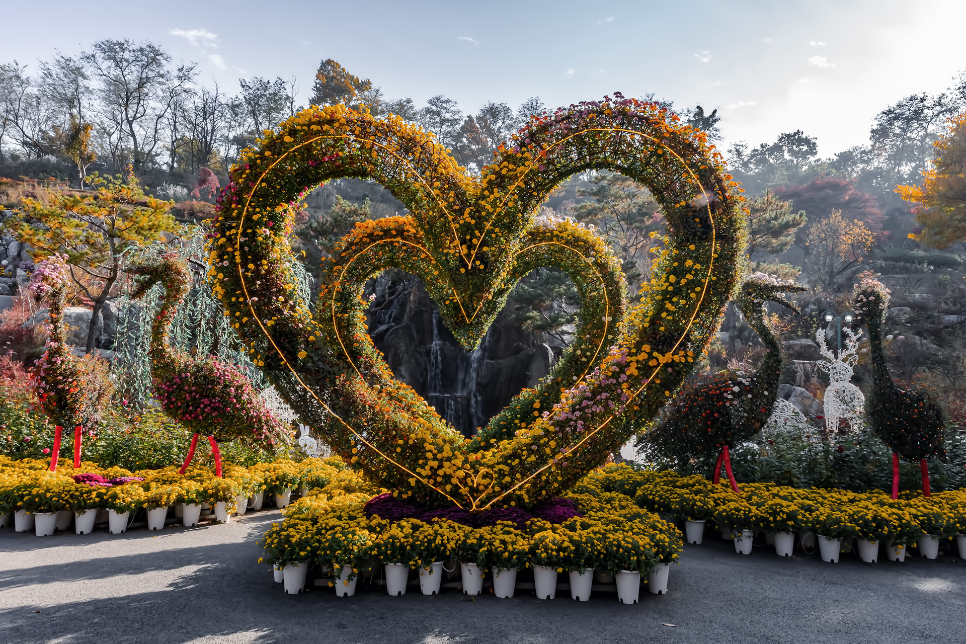 국화르 장식된 하트형 아치 조형물