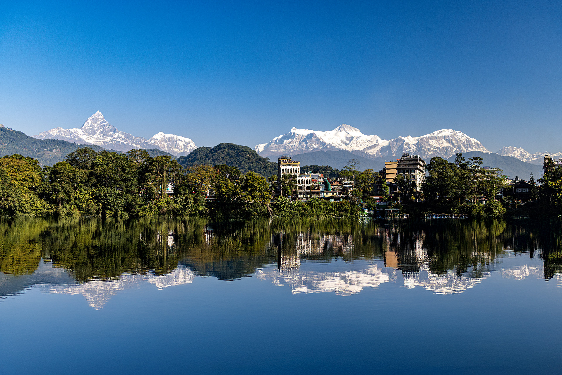 포카라 페와 호수 에서 본 히말리야 반영