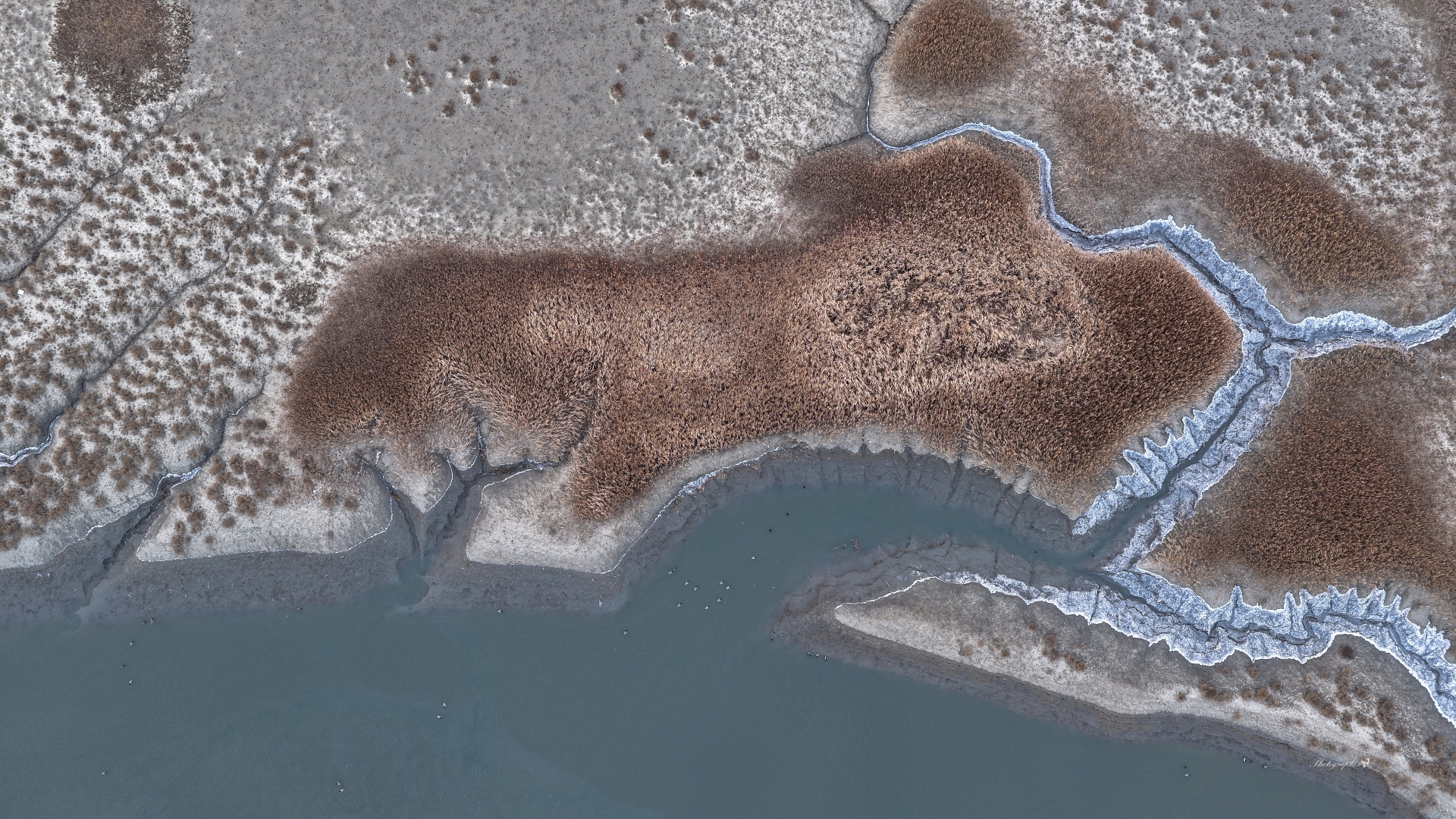 갯골은 서리를 맞아 하얀 눈썹 모양이 바닷물은 낯선 듯 잠시 망설인다....