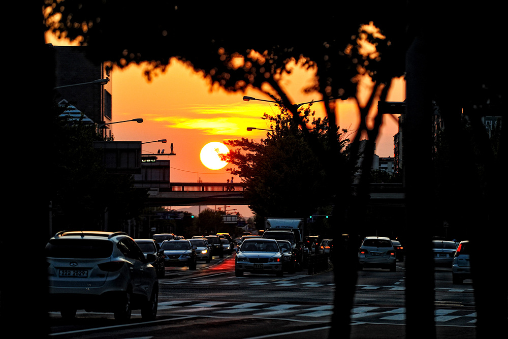 버스 정류장에서 바라보는 도시인들의 바쁜 일상을 일몰과 함께 조감하여 본다.