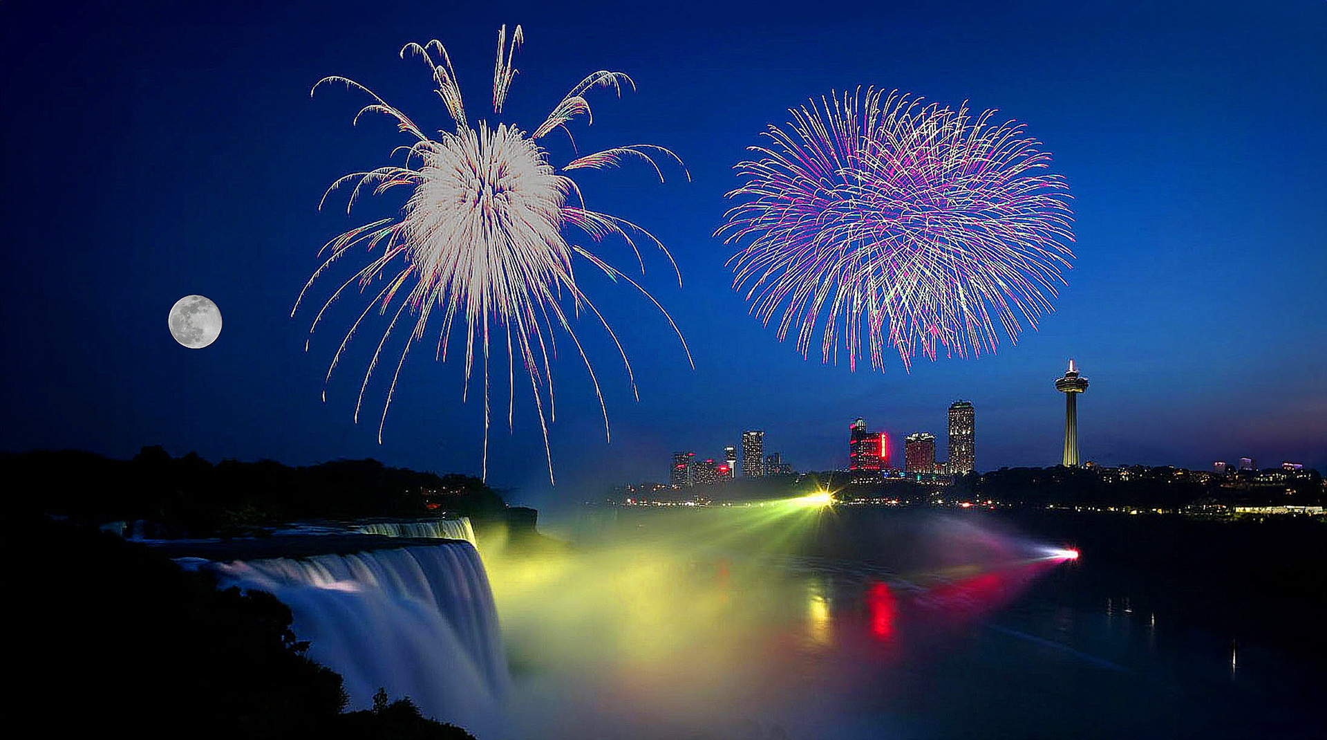 폭포 건너인 카나다에서 불꽃축제 하는 모습