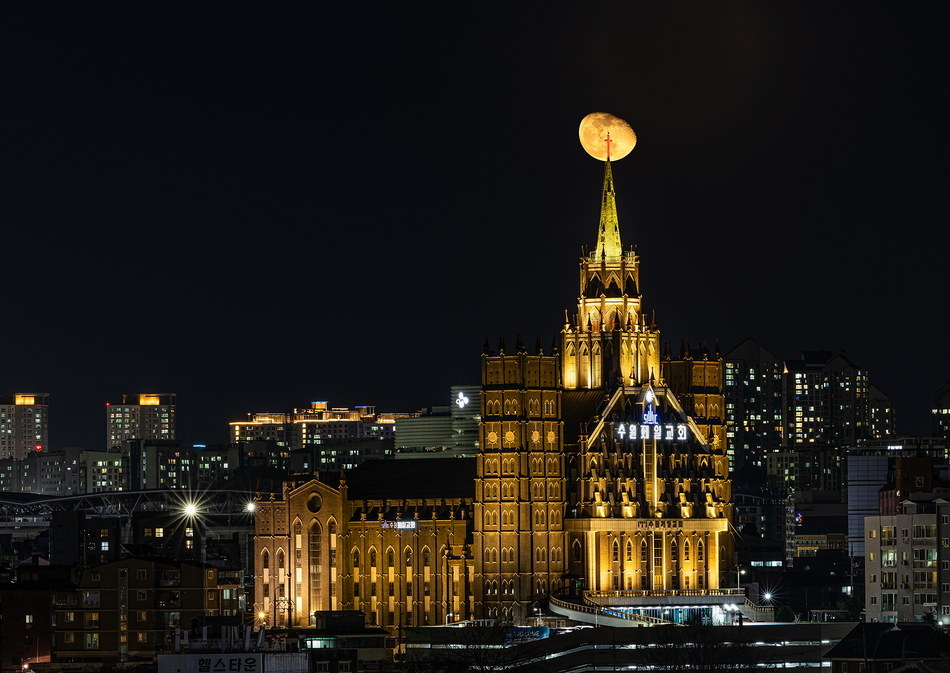 아름다운 교회에 달이 걸리기를 기다리던중