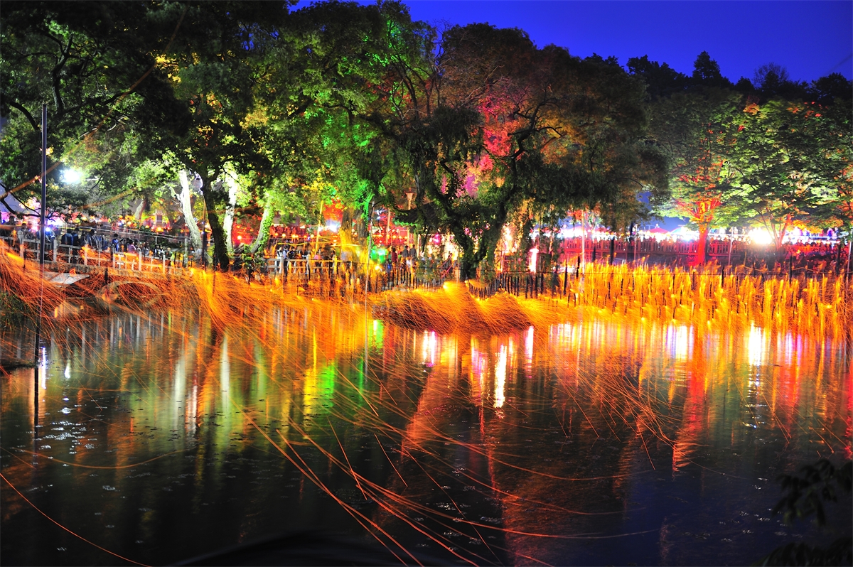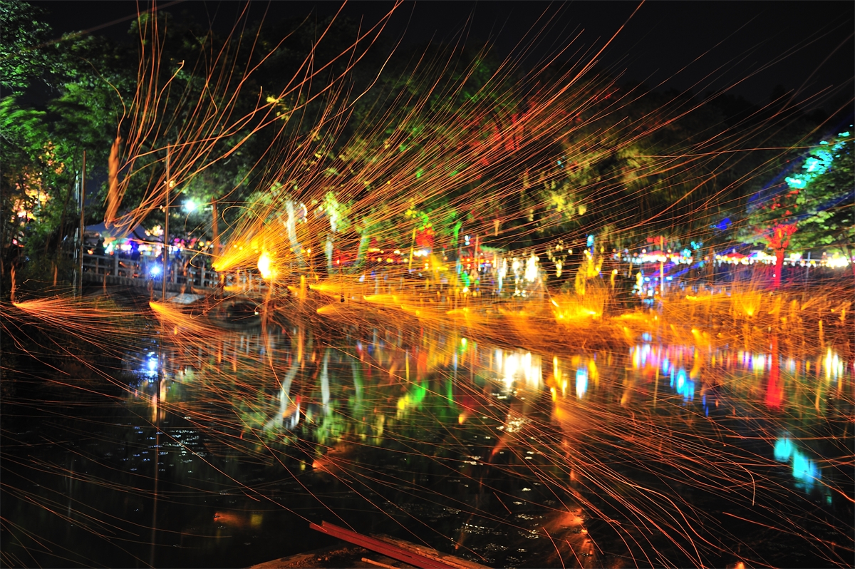 옛부터 내려오던 방식으로 밤불꽃놀이를 재현하는