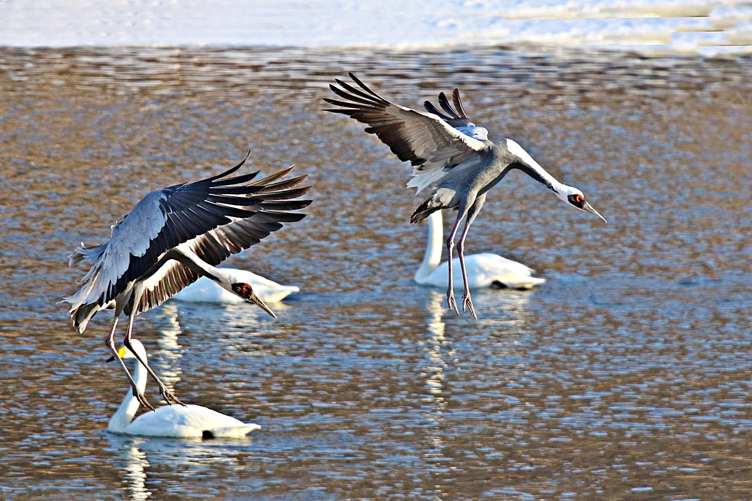 큰고니가 있는곳에 재두루미가 착지하는 순간의 모습...