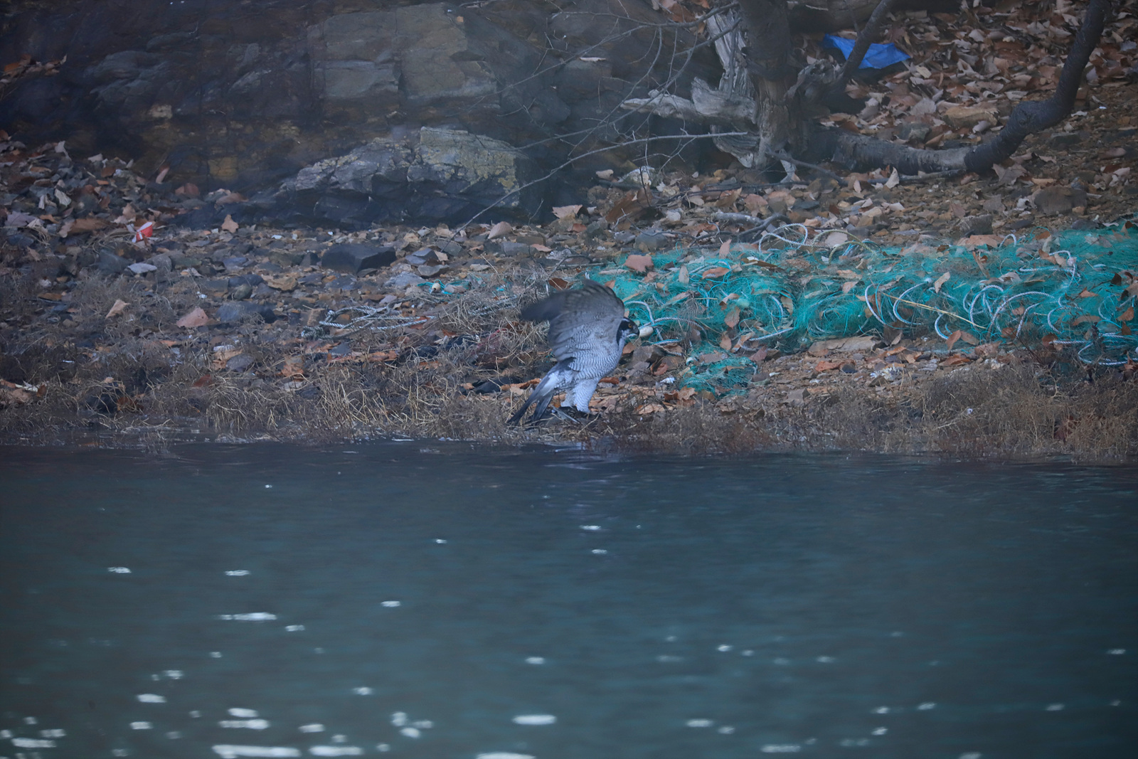 바닷가에서 청둥오리를 사냥하고 있는 모습