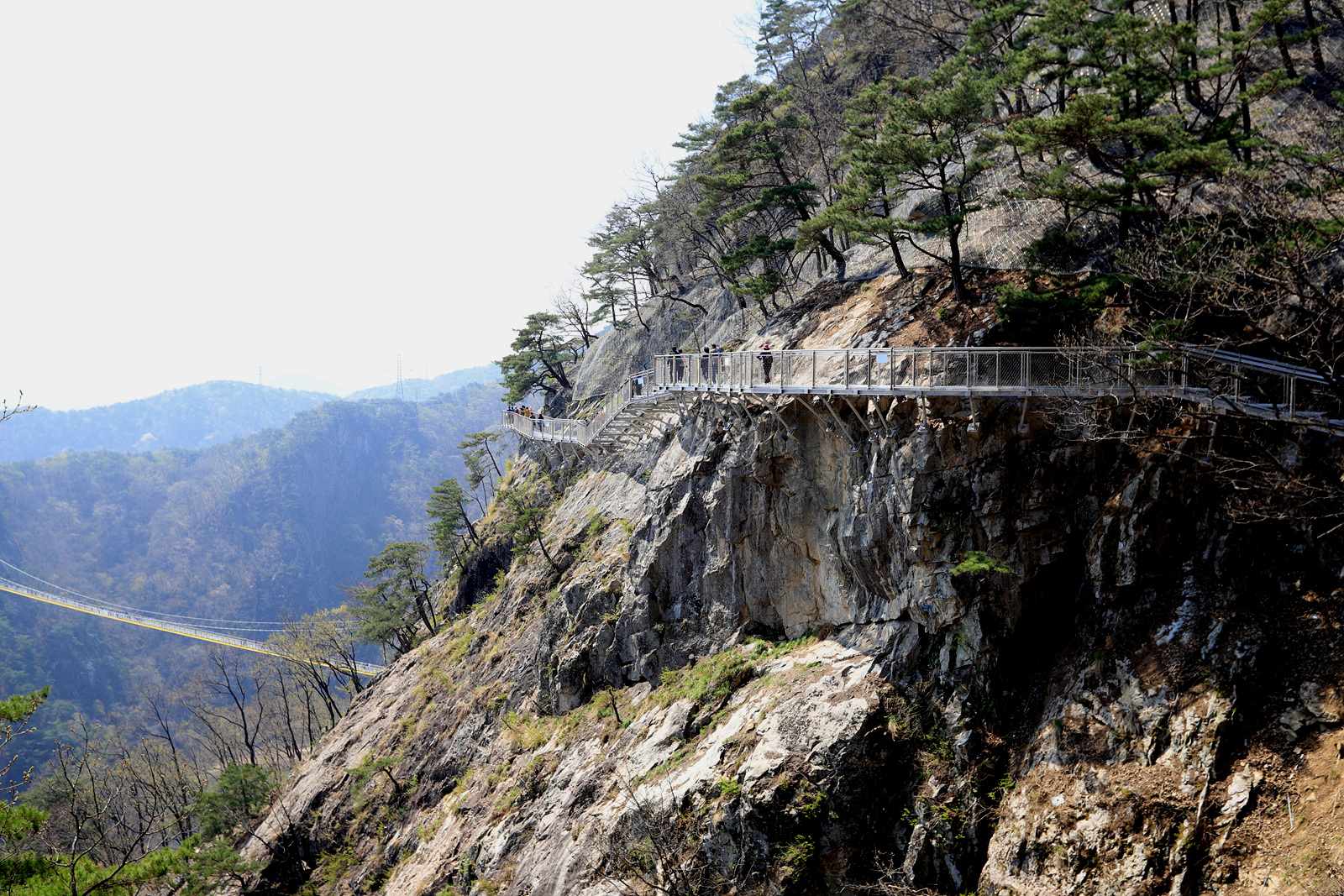 절벽에 설치된 잔도길과 멀리 보이는 울렁다리 가 보인다