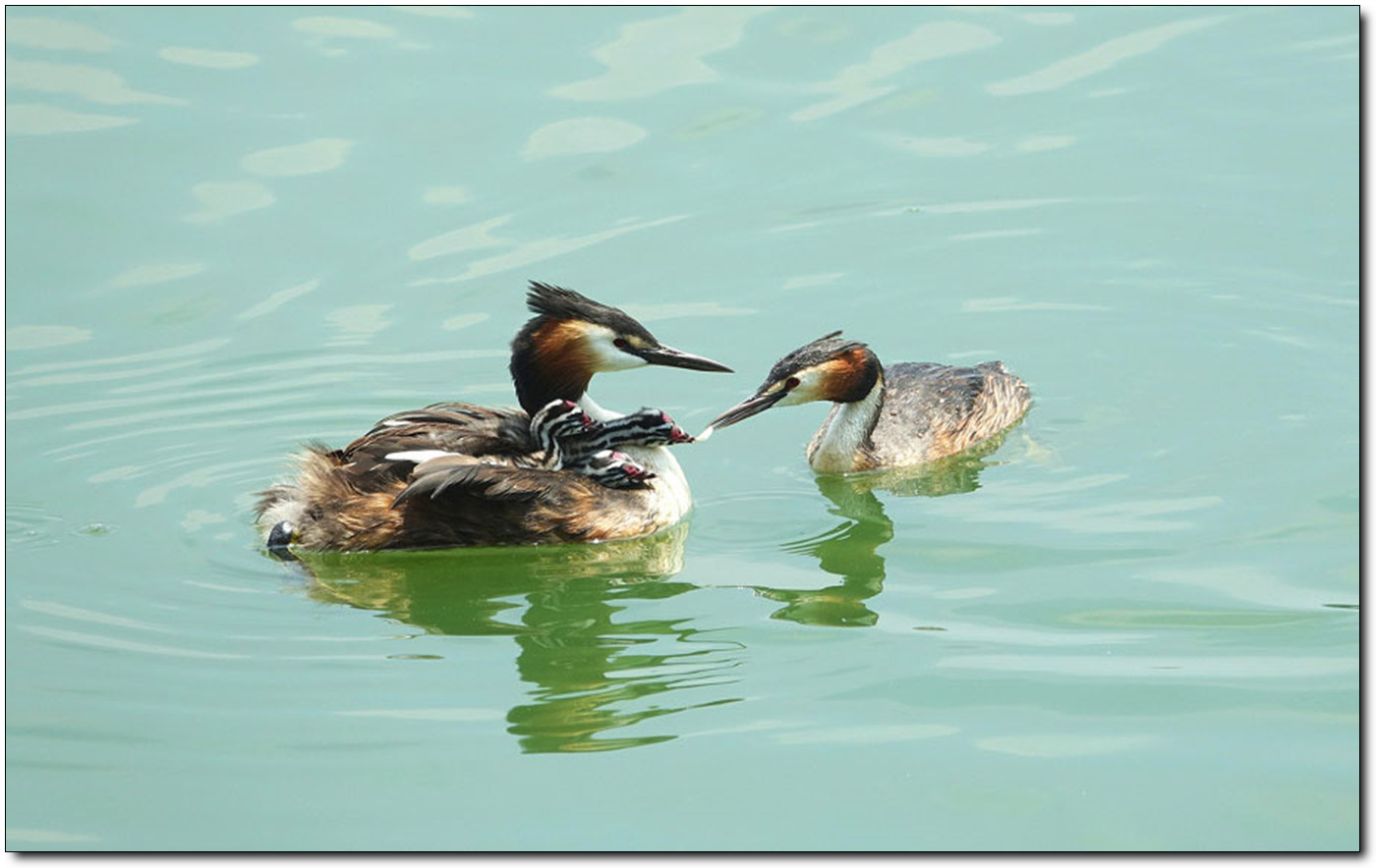 어미가 애기에게 먹이을 건너주네요
