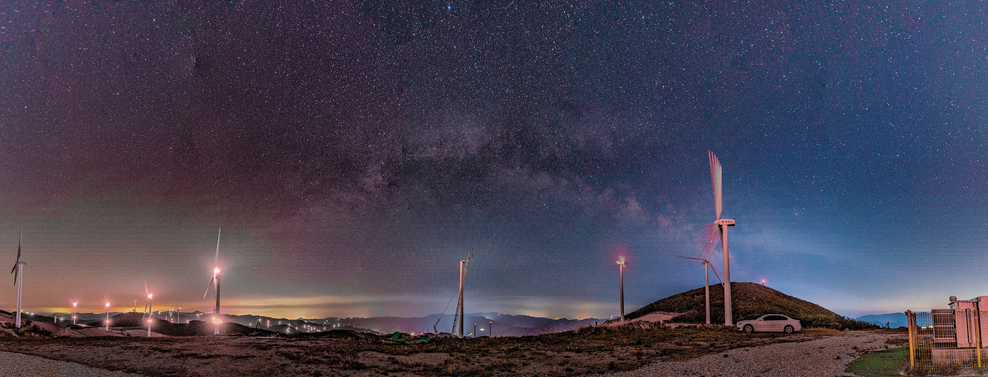풍력 발전기의 보안등 그붉은색이 화면가득 장미꽃이 만발한 풍경이 펼쳐진다 광해가 가득한 산위 힘들고 외로운 싸움에서 억지로 한장 만들어 보았다