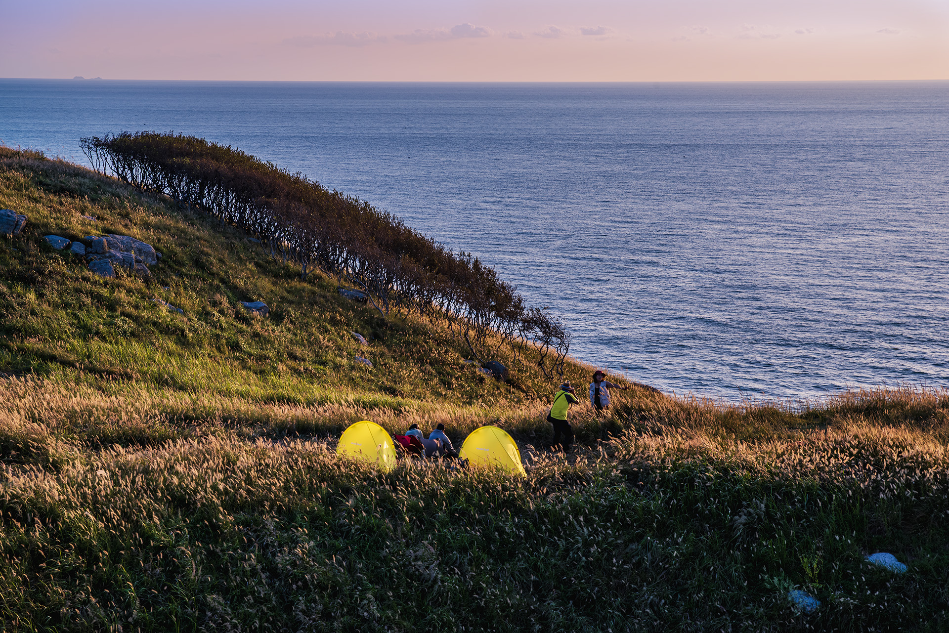 굴업도의 일몰에 비친 노을빛 스크렁 풀숲이 아름답다.