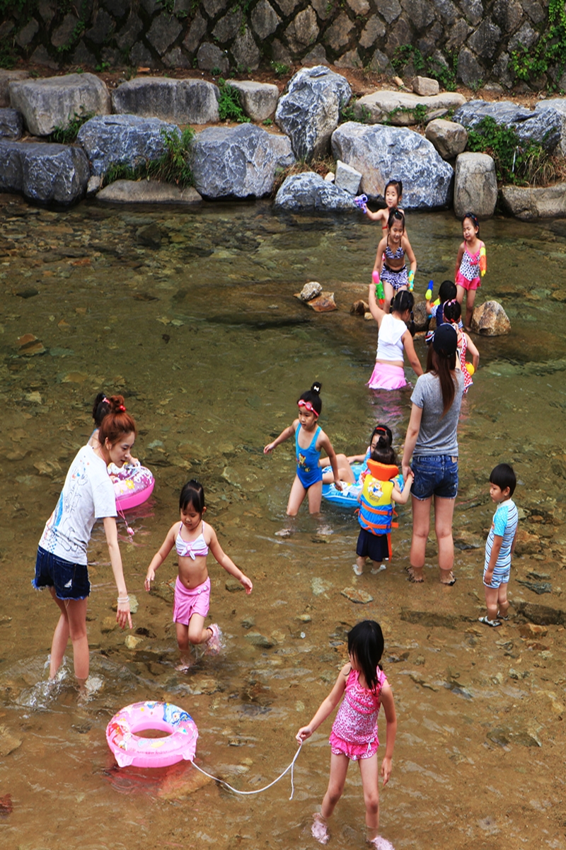 안양 개천에 물놀이하는 어린이들모습.