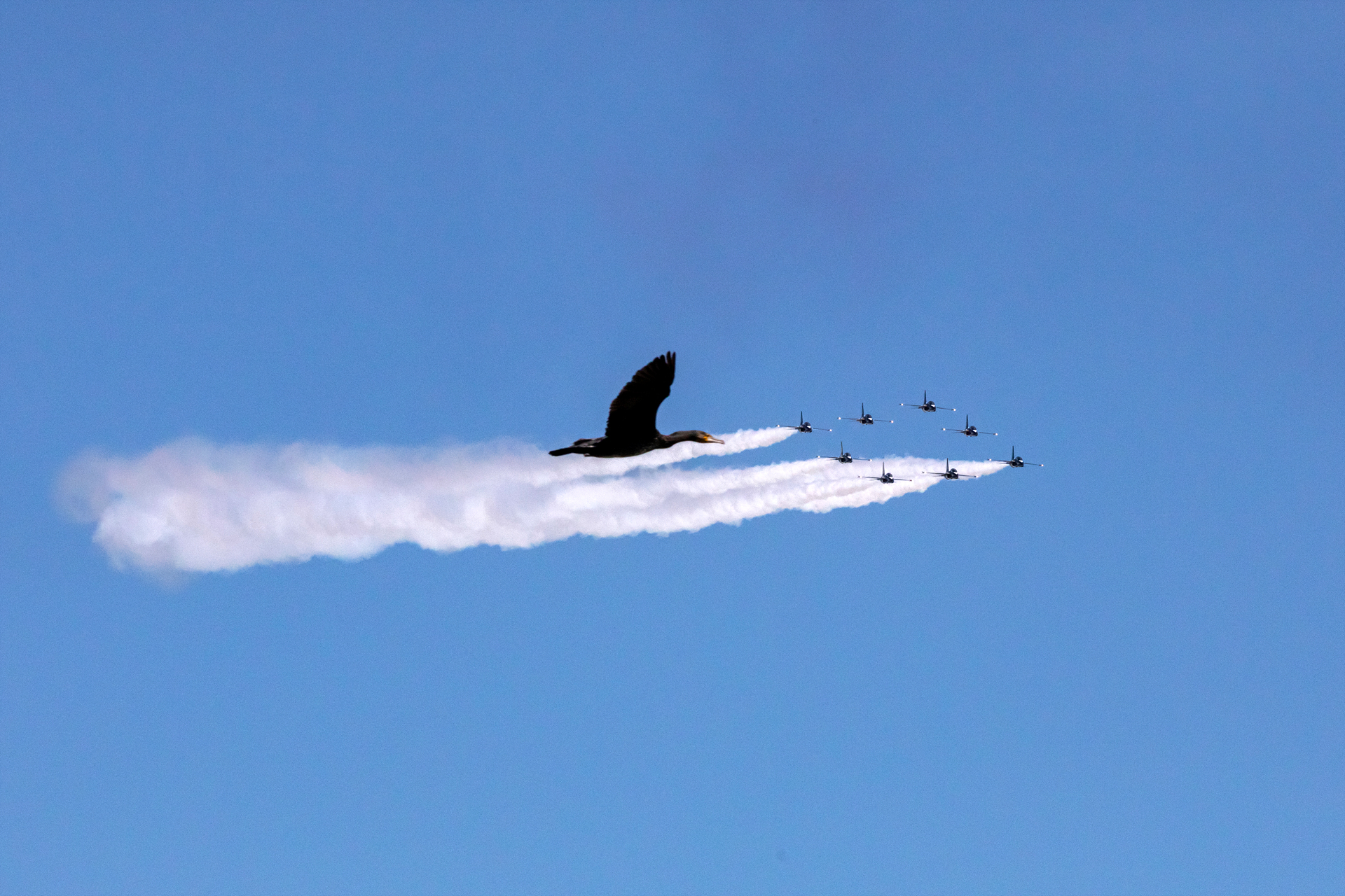 비행소리에 놀란 가마우지가
