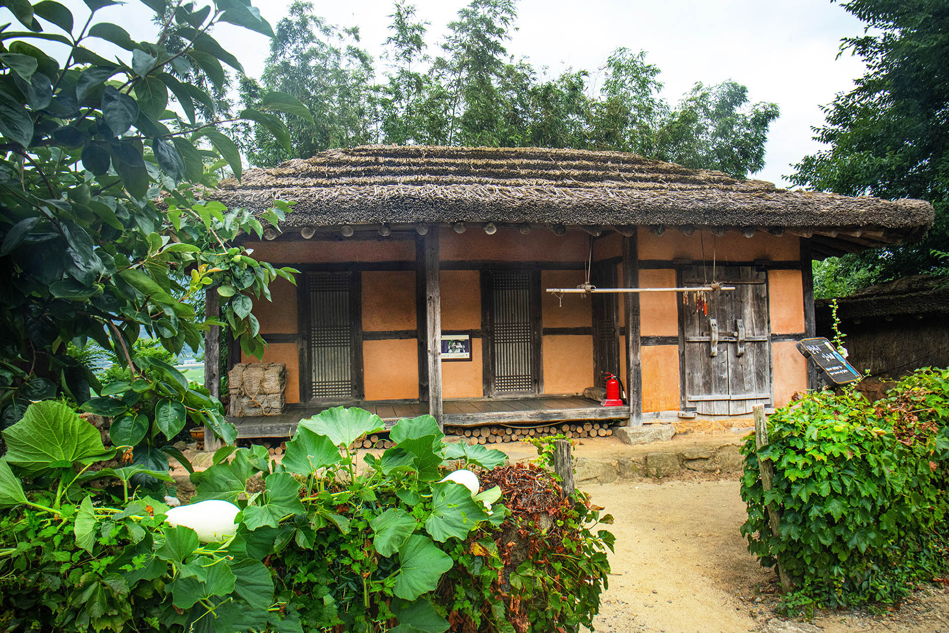 초가집 담장에 박이 달려 있어