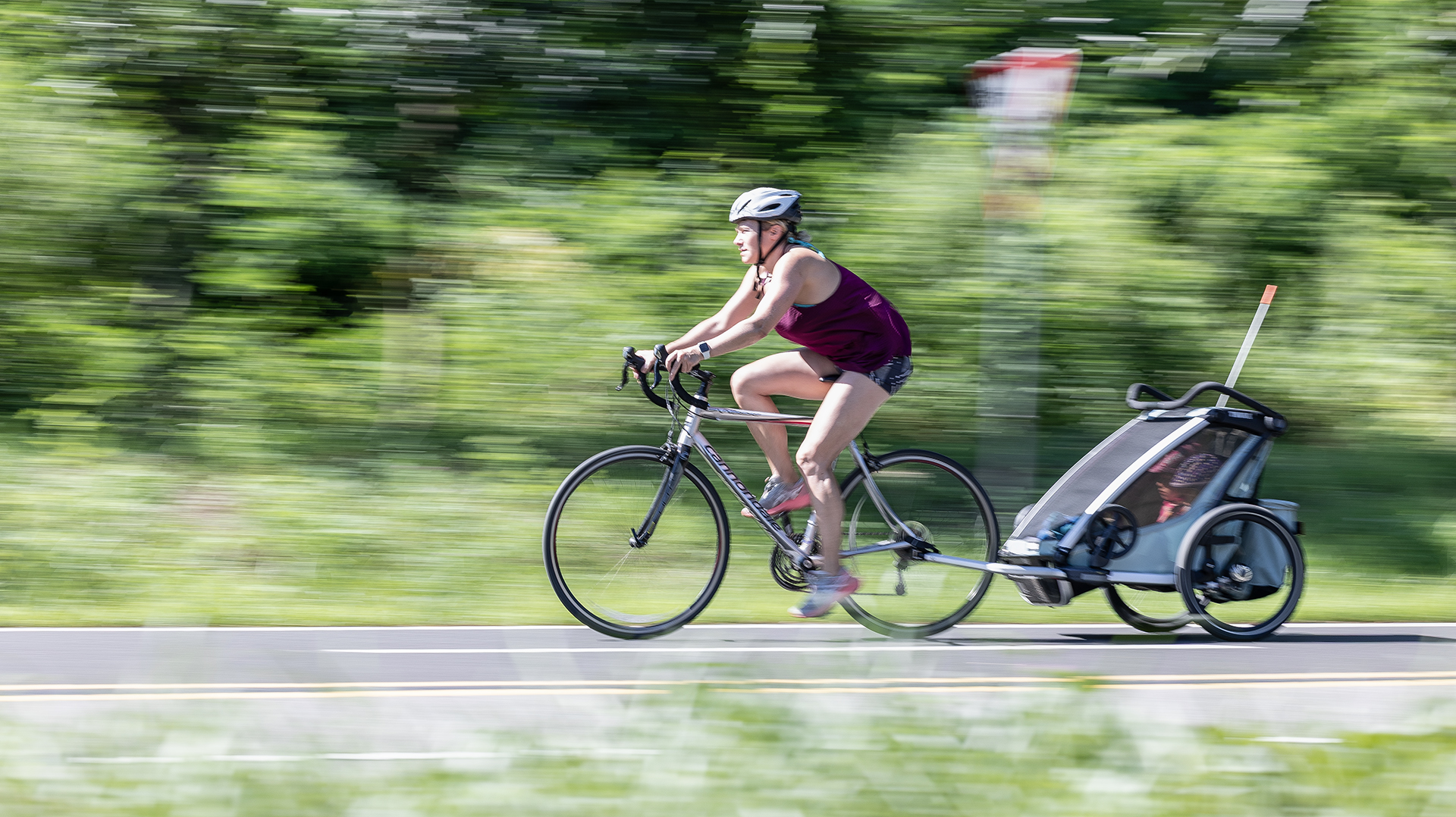 한간변에서 두발 자전거로 두아이를 태우고 달리는 엄마의 모습을~~