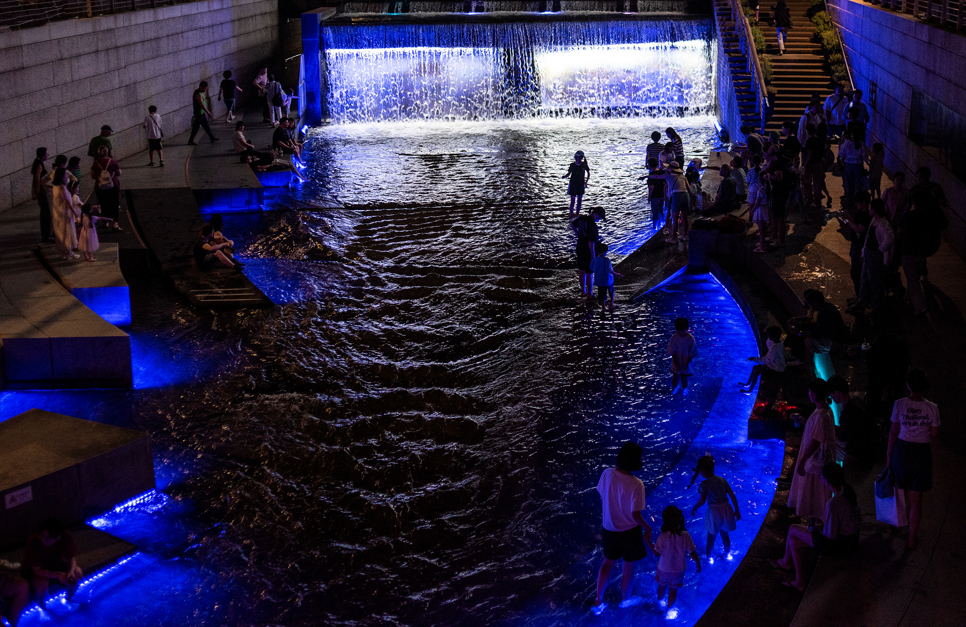밤에 많은 시민들이 모여 청계천에 발을 담그며 무더위를