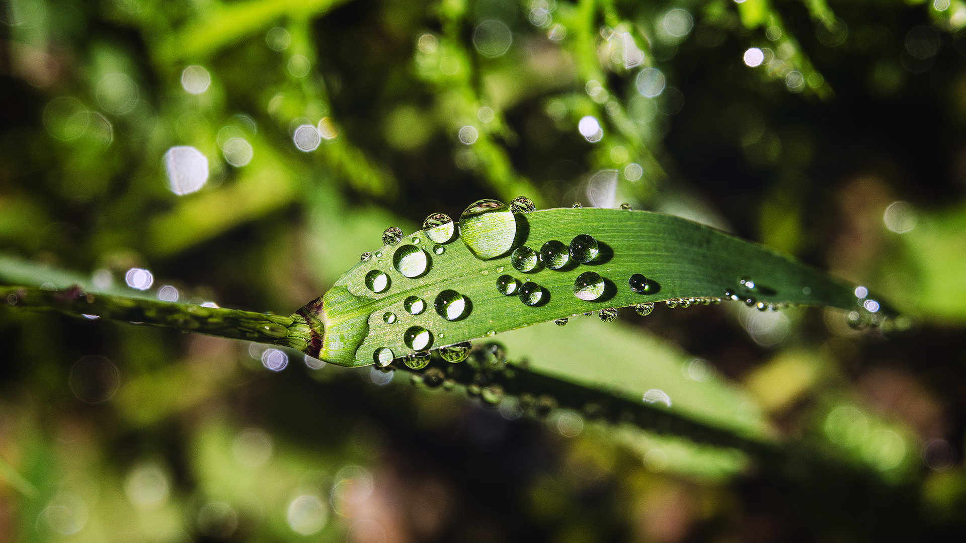 아주 작은 파란 잎사귀에 맺혀있는 물방울들을 발견