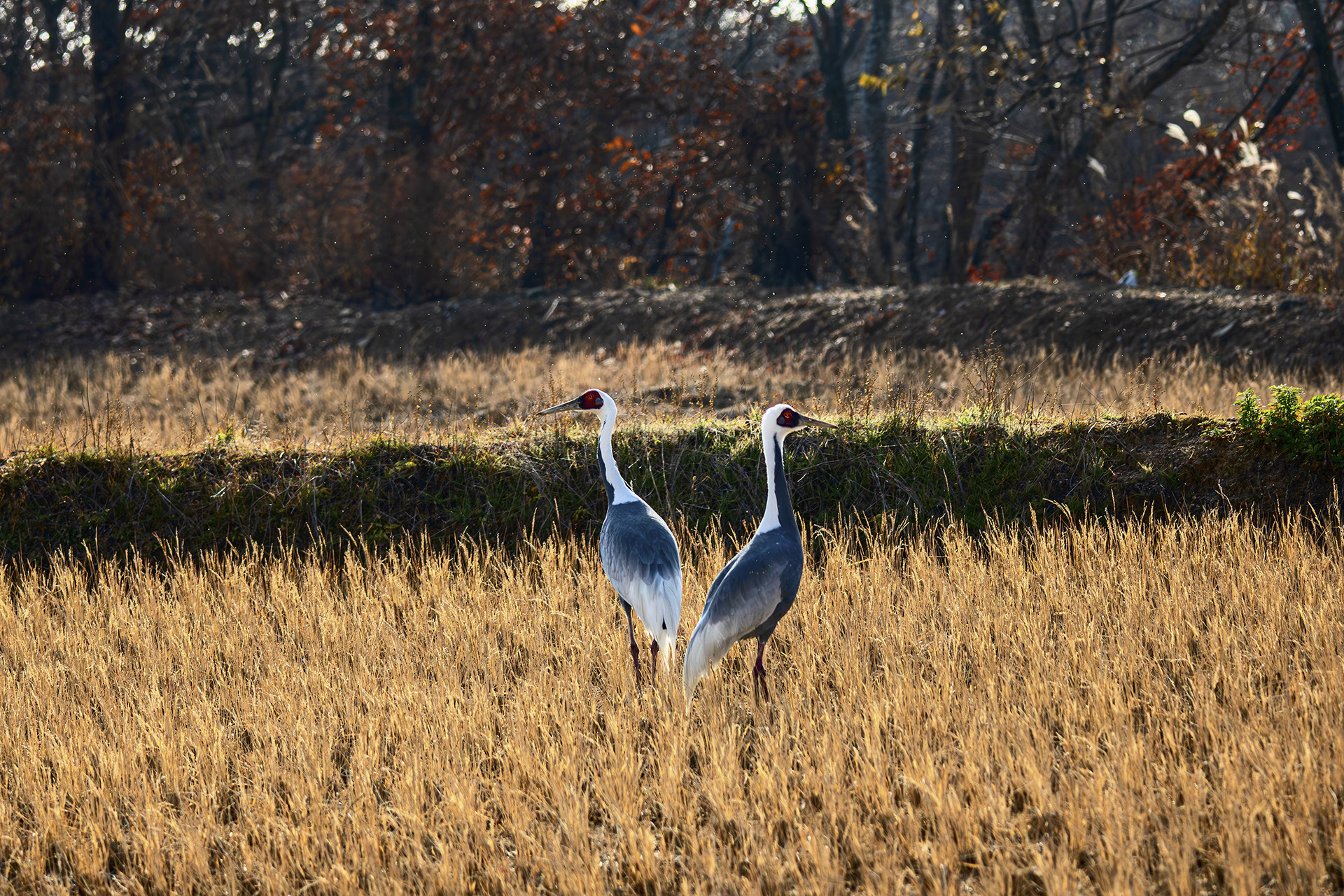 놀라 두리번거리는 두루미 부부