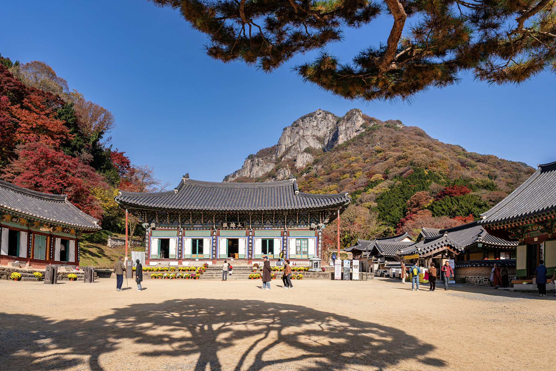 대웅전 뜰에 푸른소나무와 검은 소나무..