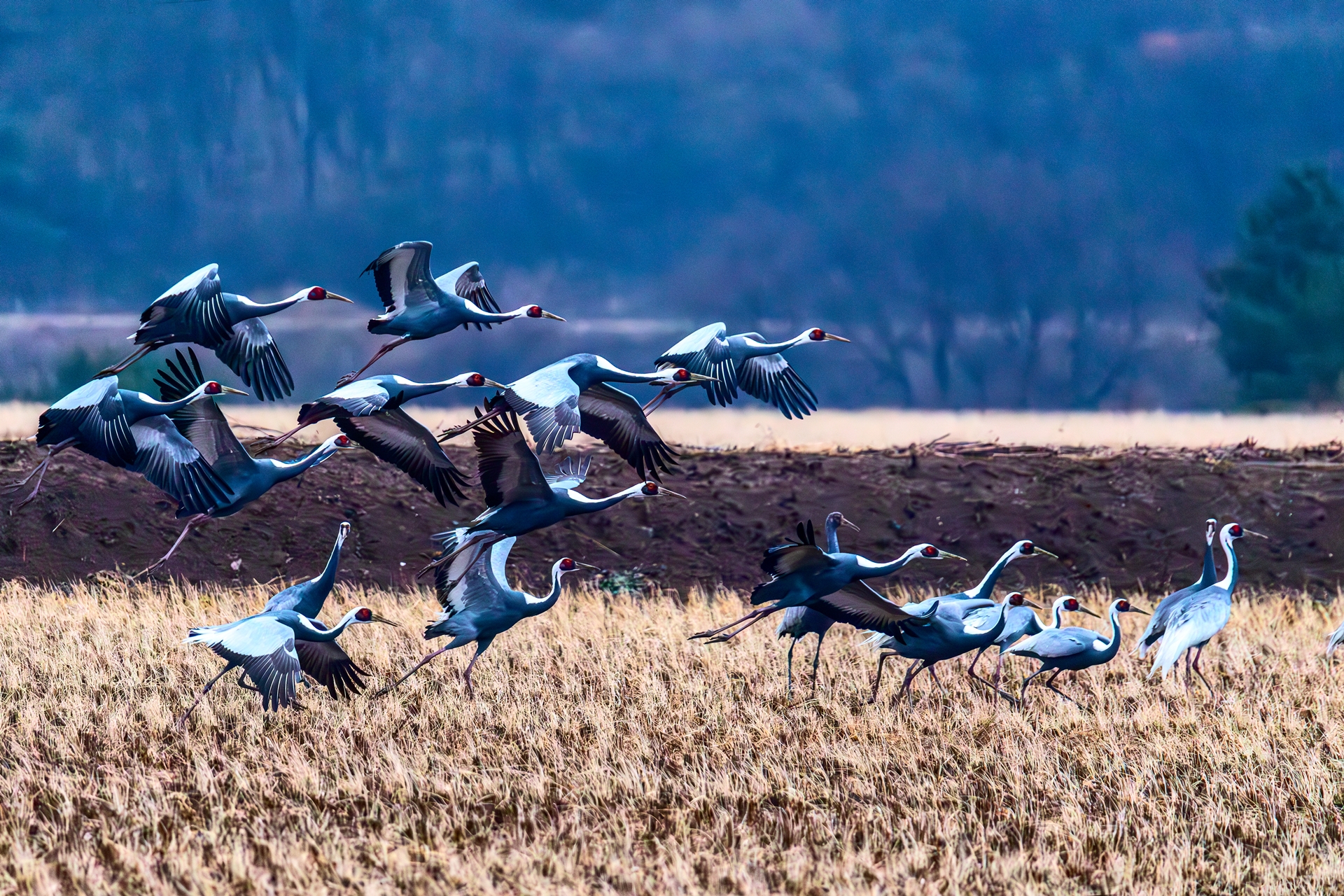 비오는 오후 늦게까지 많은 두루미들이 먹이활동하고 보금자리를 향해 비상합니다.