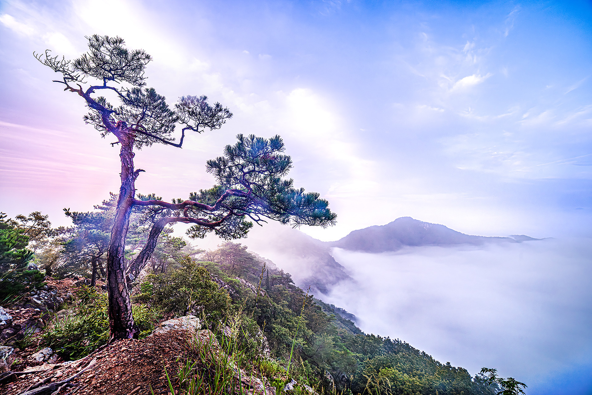 새벽 안개 속에 길를 잃고  헤매다가 우연히 찾은 소나무.