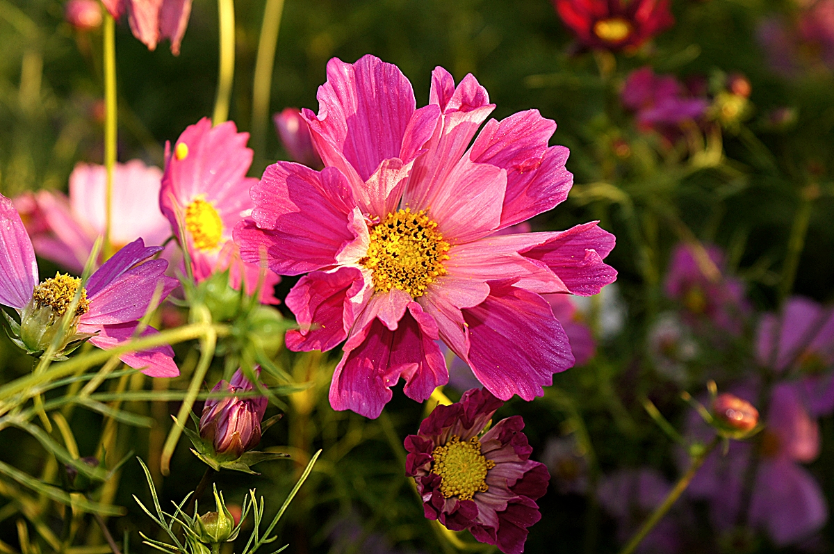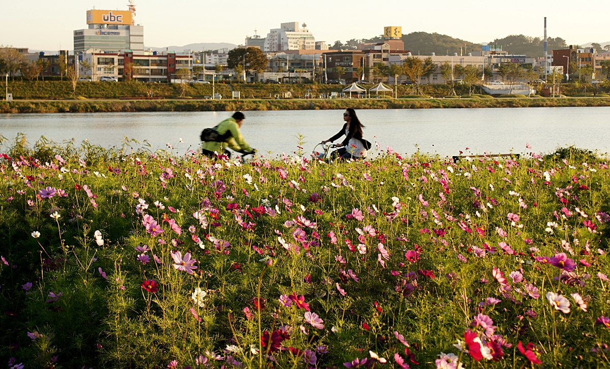 아침 햇살이 눈부시게 내려앉은 태화강변 코스모스 꽃길에서